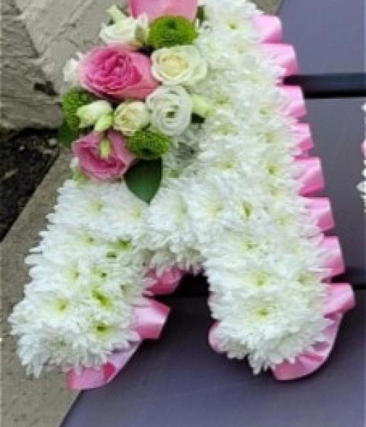 Funeral letters Based in white double Chrysanthemums with either a foliage or ribbon edge in a colour of your choice, finished with a flower crown on each end letter in complimentary colours.
