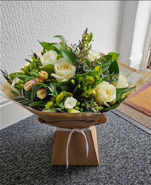 A gentle, natural hand-tied in calm creams and soft greens, featuring ivory roses, white lisianthus, blush-tinted alstroemeria and lemon freesia buds, nestled among fresh seasonal foliage (salal, ruscus and a touch of eucalyptus).
