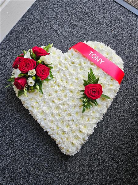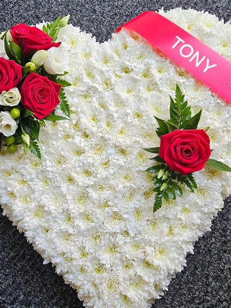Solid based hearts in white chrysanthemums with a complimentary corsage available in any colour of your choosing and different sizes.