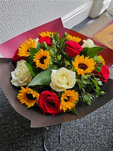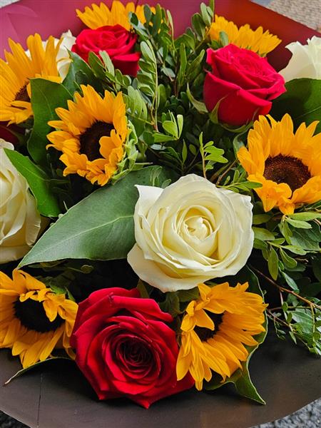 A radiant hand-tied combining golden sunflowers with classic red and ivory roses, finished with fresh seasonal greenery (ruscus/salal). Bright, warm and gently uplifting, a lovely mix of sunshine tones and timeless roses for any occasion. Please note this bouquet is Pet Safe.