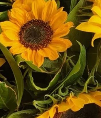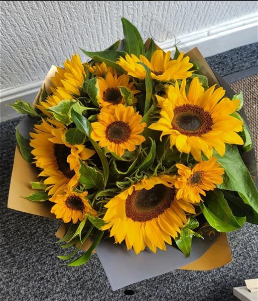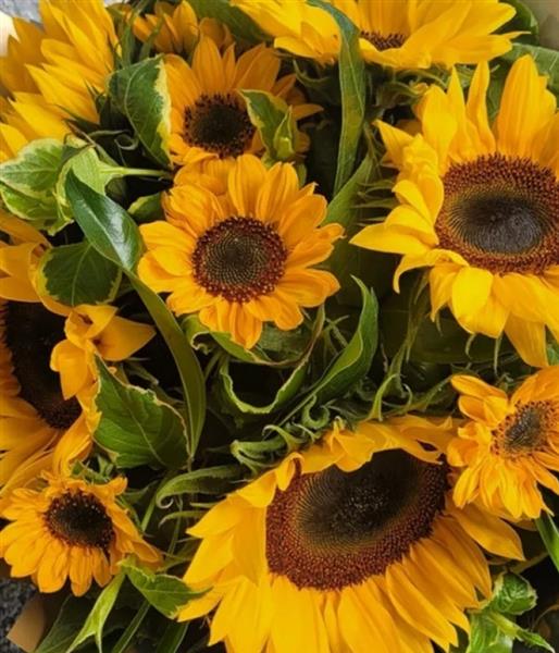 A radiant hand-tied brimming with large-headed sunflowers, gathered simply with fresh leafy greens (salal and variegated pittosporum/seasonal foliage). Sunny, bold and gently uplifting — a bright hello for any occasion.