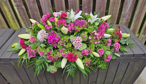 3ft spray of mixed foliages, Sweet Williams and White Lilies spray.