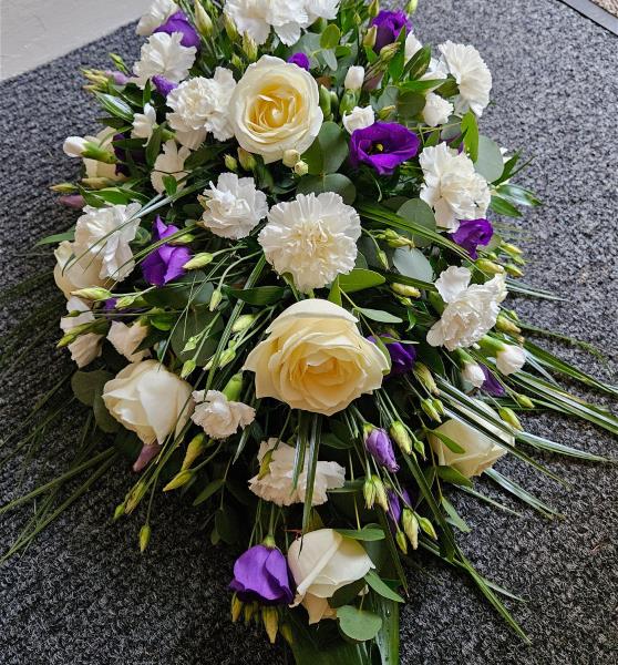 Perfect for memorials and funerals, this casket spray embodies modern grace while honoring tradition. Allow its soothing palette and thoughtful arrangement to convey what words often cannot. A fitting tribute for a loved one, designed to offer solace and beauty.