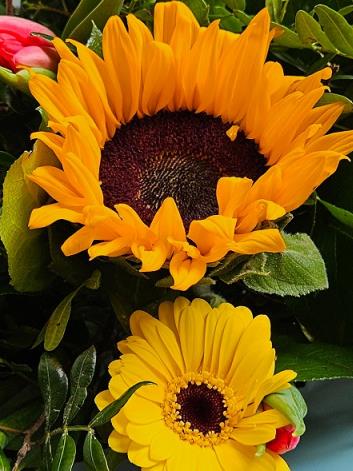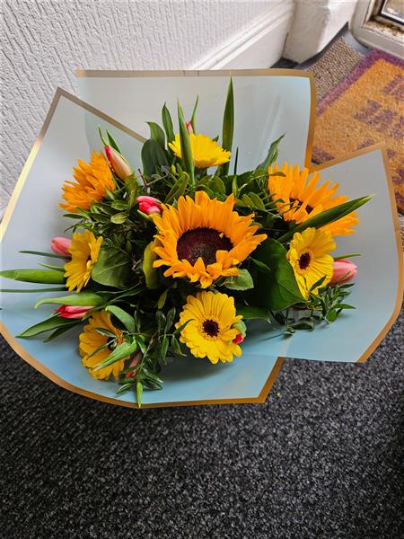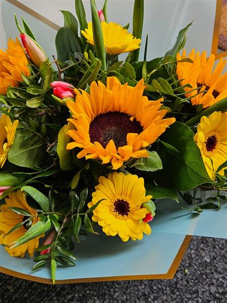 A cheerful hand-tied filled with golden sunflowers and sunny yellow germini, accented with pretty pink tulip buds and fresh leafy greenery (salal/seasonal foliage). Bright, friendly and gently uplifting — a lovely burst of sunshine.