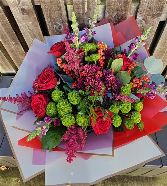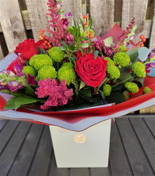 A striking and luxurious hand-tied bouquet featuring rich red roses paired with vibrant green and red chrysanthemums, elegant astilbe and iklex berries. Beautifully complemented by lush seasonal foliages, this arrangement exudes warmth, passion and sophistication.