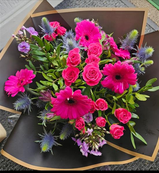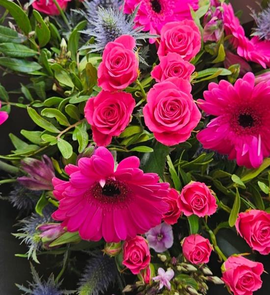 Radiant and refined, this stunning bouquet blends the bold beauty of cerise mini gerberas and cerise spray roses with the striking texture of thistle and the soft charm of purple phlox. Lush pistache foliage adds depth and a touch of natural greenery, creating a perfect balance of color and texture. Expertly arranged in a luxury wrap and presented in an elegant gift box, this bouquet makes a vibrant statement — ideal for celebrating life’s most special moments.