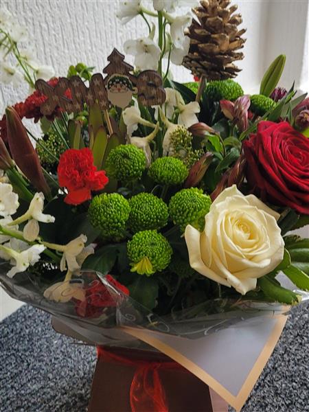 A stunning and luxurious display featuring rich Red Naomi Roses and elegant Cream Avalanche Roses, beautifully complemented by striking red lilies and red alstroemeria. Vibrant green chrysanthemums and delicate white delphinium add texture and contrast, while red spray carnations and festive skimmia bring warmth and fullness. Expertly arranged with mixed seasonal foliages and presented in a complimentary luxury gift box, this bouquet is a perfect expression of sophistication and heartfelt sentiment.
