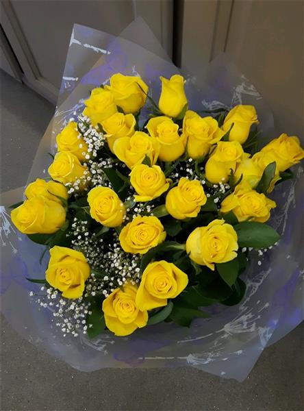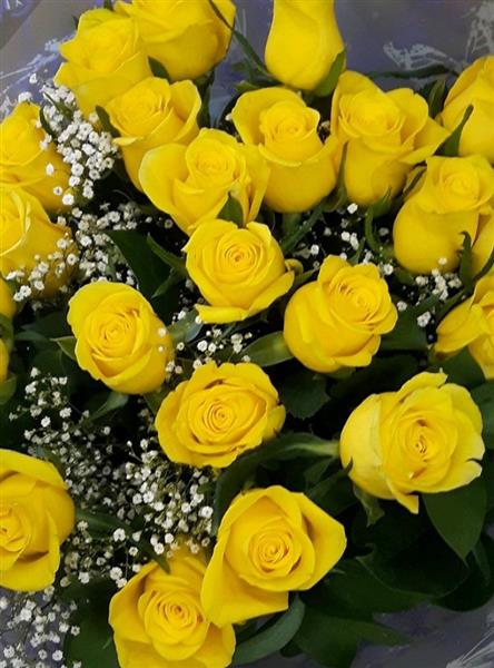 A radiant hand-tied of sunny yellow roses, softened with cloud-like gypsophila and fresh leafy greenery. Bright, cheerful and warmly uplifting, perfect for sending a little optimism and light.